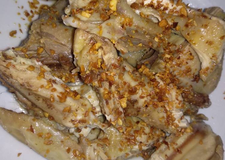 - Angkat dan potong2 ayam, susun di piring. Kuah kaldu dari kemasan jgn dibuang ya, tp tuang aja kr atas ayam nya. Beri 2 sdm minyak wijen + taburan bawang putih goreng. Siap disajikan. Kl ada bs d kasih daun ketumbar ya gaes, trs d makan brg cocolan kecap asin+manis dkt+ cabe rawit.. sedaapp.